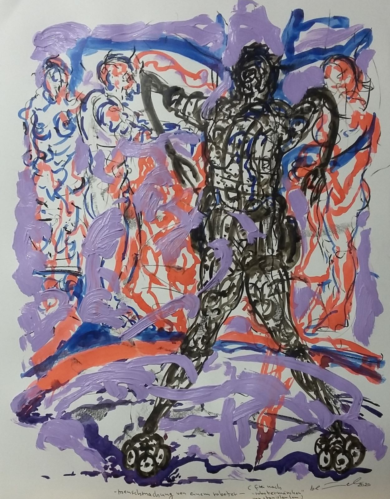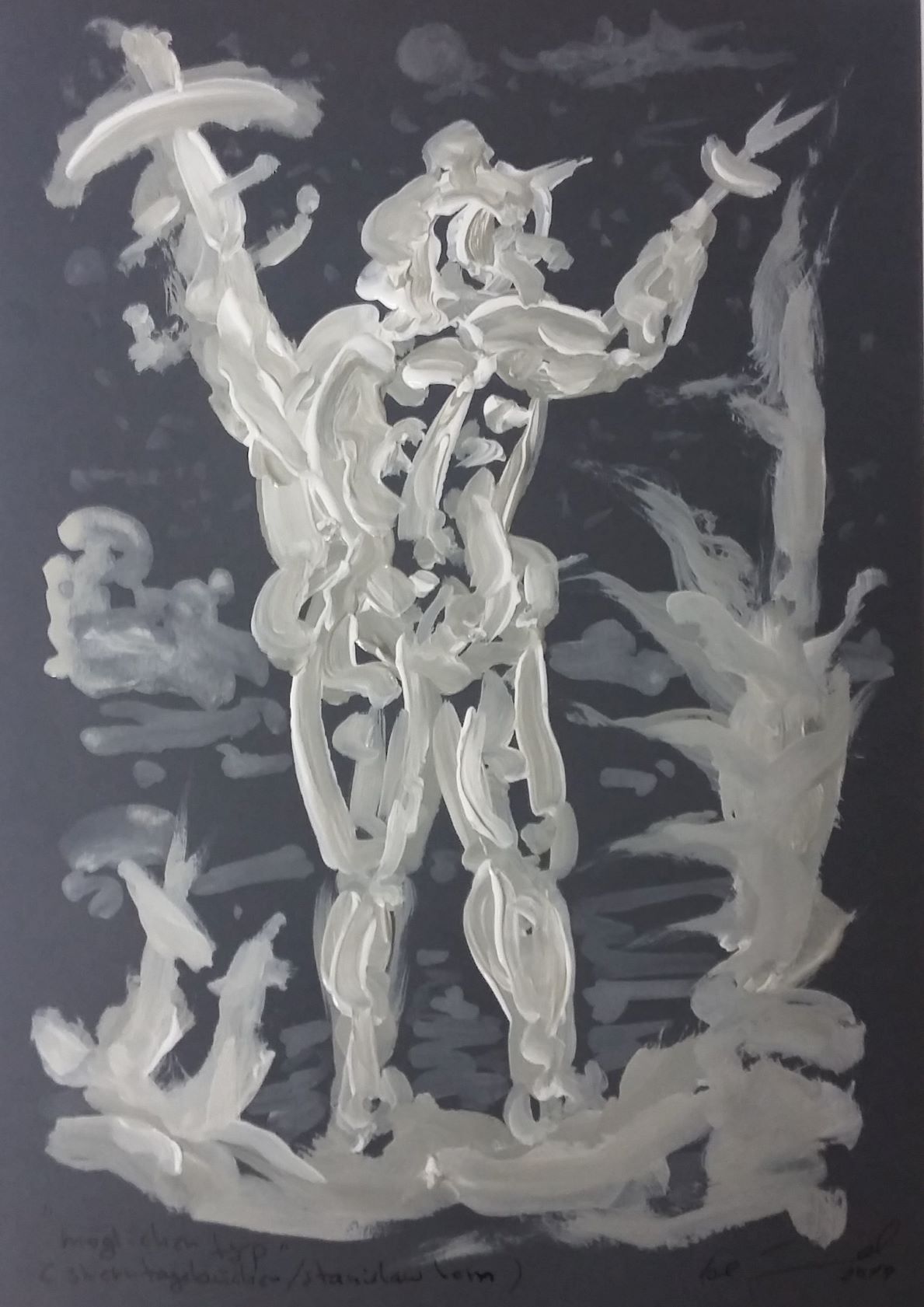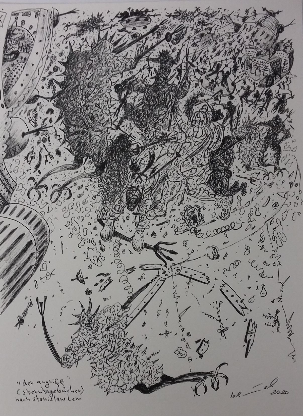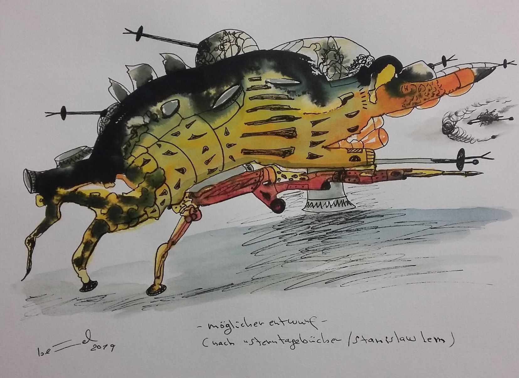 eine auswahl illustrationen (skizzen, zeichnungen, mischtechniken, malerei, druckgraphik, objekte) nach: "robotermärchen", "sterntagebücher", "solaris", "fiasko", "futurologischer kongress", u.a.m.